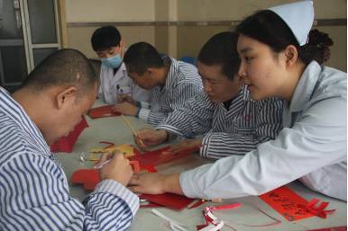 在采取药物、行为矫正、心理辅导、微创等方式进行治疗的同时,开展工娱治疗、心理治疗、家庭治疗。通过组织医务人员耐心的辅导与鼓励,帮助健康病人逐渐学会穿衣叠被、包饺子、手工剪裁和编织,同时增设了歌唱、舞蹈、篮球、乒乓球,跳绳等10余项文体育活动,既丰富了病人的精神生活,又让他们掌握了从料理内务到生活技能的本领,为以后融入社会做好了准备。