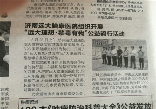 24小时免费咨询电话:400-1616-1206月25日上午,由济南市禁毒委员会、历城区禁毒委员会主办,济南远大中医脑康医院承办的以“远大理想·禁毒有我”为主题的大型禁毒公益骑行活动在济南远大中医脑康医院隆重开幕。